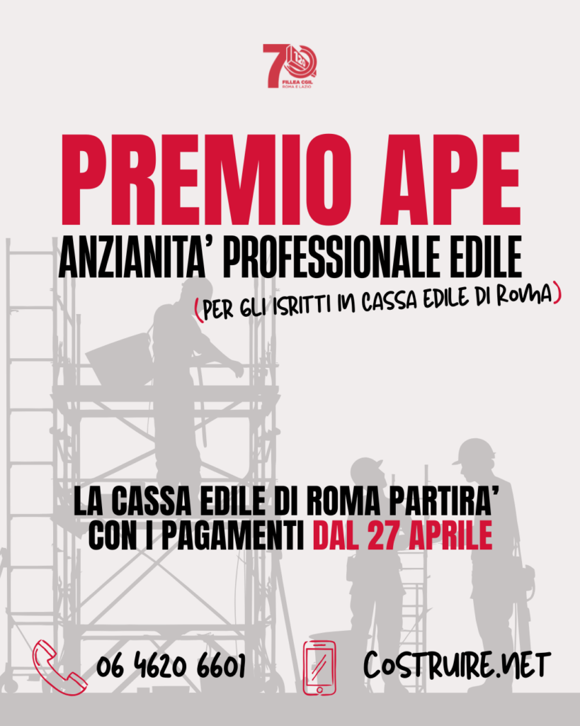 La Cassa Edile di Roma avvierà a partire dal 27 aprile le erogazioni del Premio APE (Anzianità Professionale Edile), una prestazione economica prevista dalla contrattazione collettiva nazionale di settore.